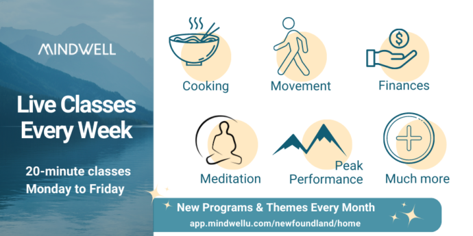 Live classes are happening every weekday including physical fitness, mindset coaching and meditation practices to help you decrease stress, build resilience and improve your overall well-being.