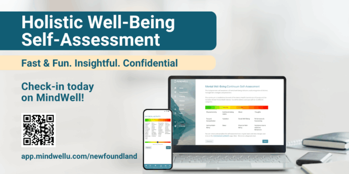 This easy-to-use tool provides a personal snapshot of your well-being across twelve areas, including physical health, mood, thoughts, and social connection. It’s designed to help you pause, reflect, and better understand how you’re doing.