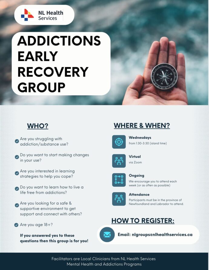 This group is for people who are in the early stages of making changes and looking at how to live their life alcohol, drug &/or gambling free. Complete abstinence is not required to join, but people are working toward an addiction free life. Support will be provided by Clinicians of NL Health Services to group members to explore their use, set goals, and to gain skills to make changes in their life. This is a safe, non-judgmental space.