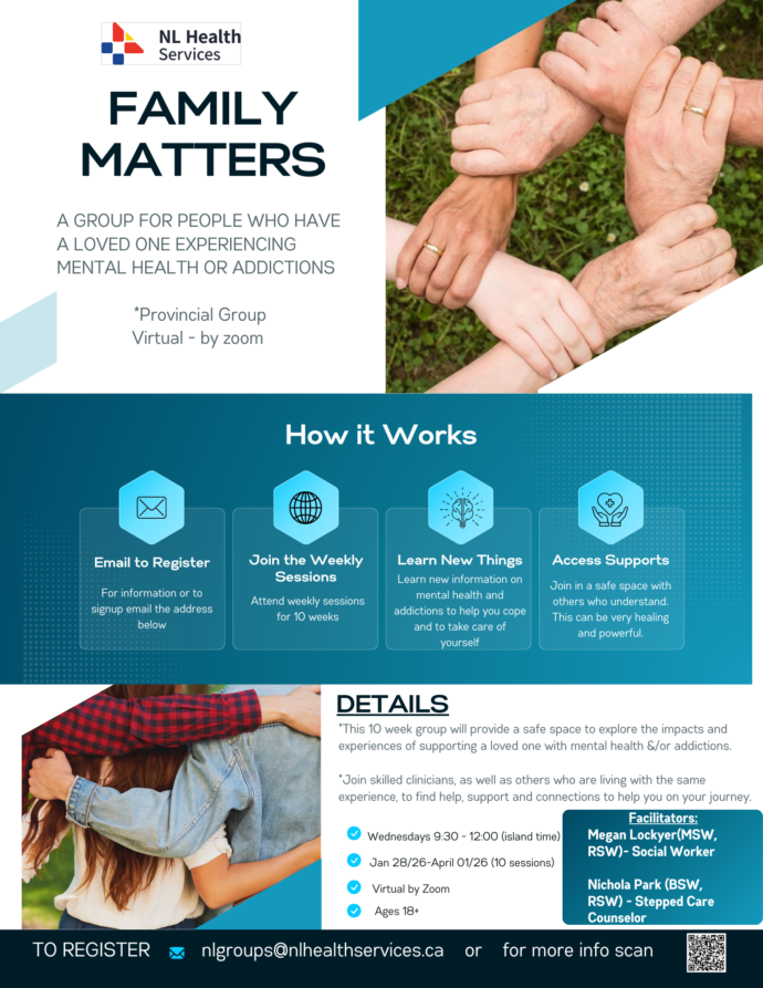 The Family Matters Group will be offered on Wednesdays starting January 28, 2026 to April 1, 2026 and will be held from 9:30 am – 12:00 pm island time (9:00 – 11:30 am in Labrador).