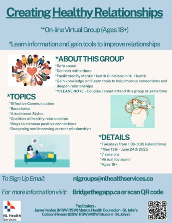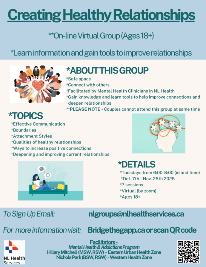 Creating Healthy Connections will be offered on Tuesdays, starting October 7th to November 25th, 2025 from 6:00 pm – 8:00 pm island time (5:30 pm – 7:30 pm Labrador). Participants need to be able to attend all sessions and have access to a private space from which to participate.