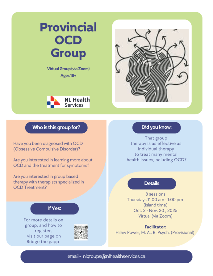 The OCD Group (8 sessions) will be offered on Thursdays- October 2, 2025 to November 20, 2025 from 11:00 am – 1:00 pm island time (10:30 am -12:30 pm in Labrador).